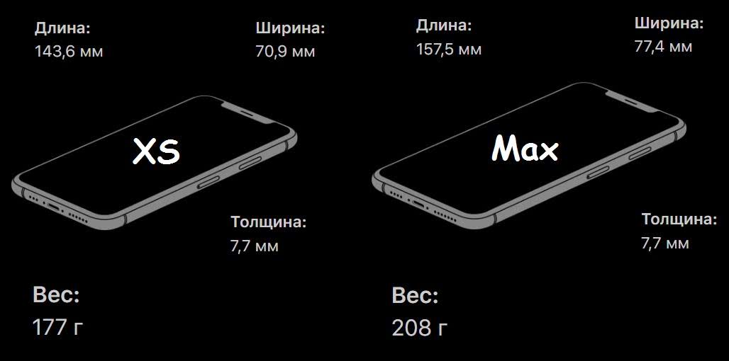 - iPhone XS Max – 157,5 х 77,4 х 7,7 мм (6,20 х 3,05 х 0,30 дюйма) и 208 г (7,34 унции).