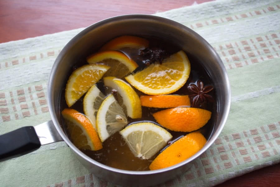 - Нарежьте лимоны и бросьте их в горячую жидкость.