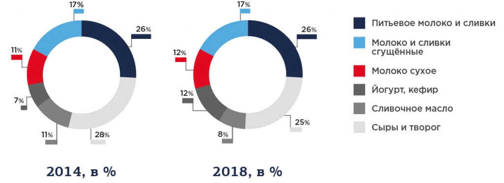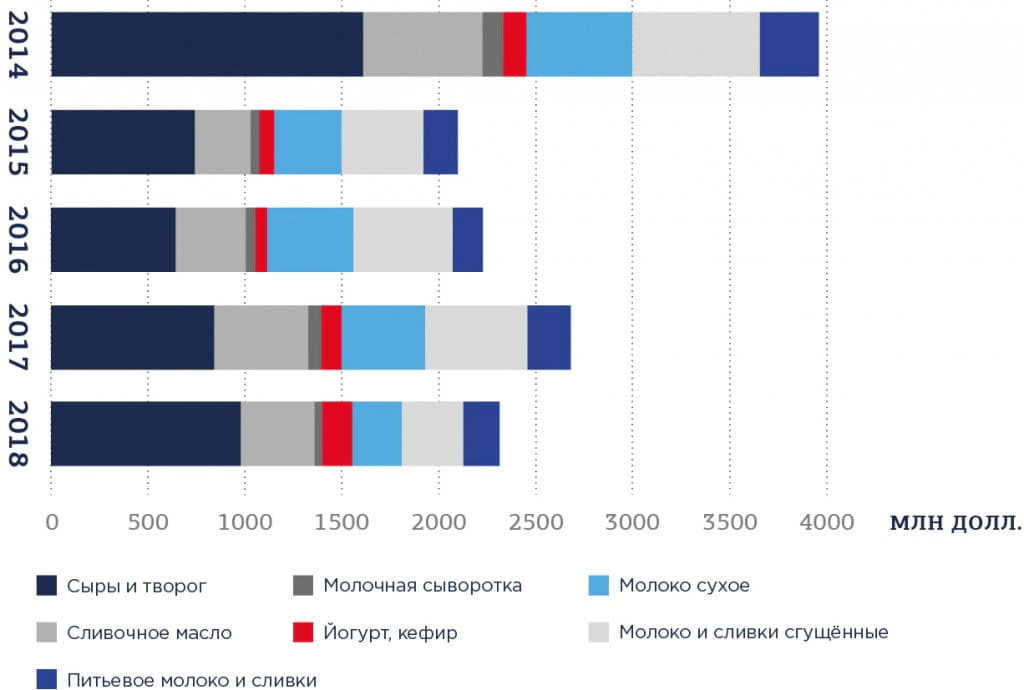 Структура импорта изменилась как в стоимостном, так и в качественном выражении. Рост отечественного производства еще не покрыл потери от сокращения импорта: если производство сыров и творога с 2014 года увеличилось на 197 тыс. тонн, то импорт сократился на 631 тысячу тонн. Сыры и творог продолжают занимать четверть всего импорта, другой весомой статьей которого является молоко и сливки.