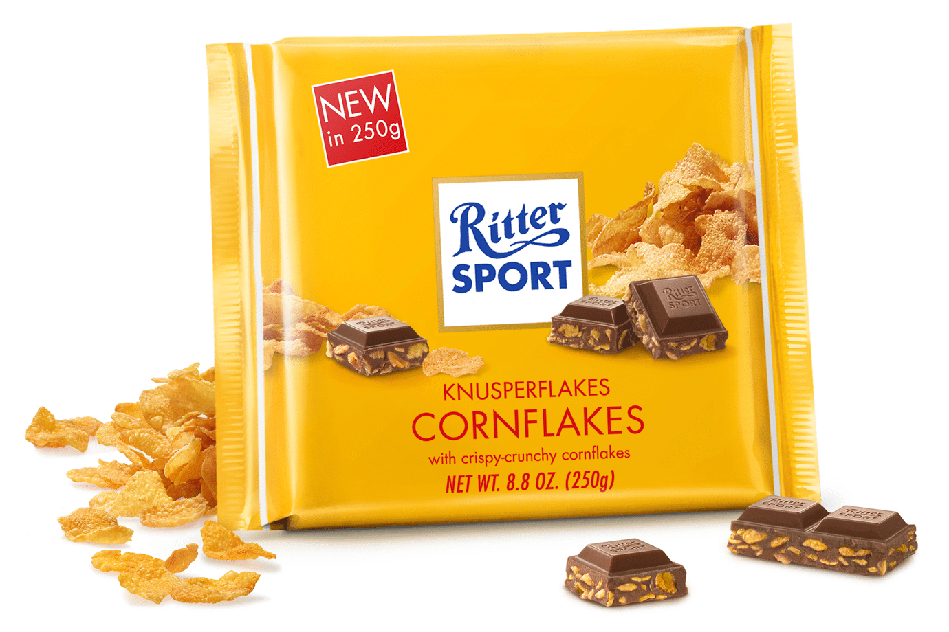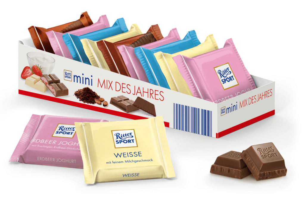 Вкусовой спектр шоколада «Ritter Sport» сейчас насчитывает 55 видов шоколада. Причем каждый тип завернут в собственную уникальную разноцветную упаковку.