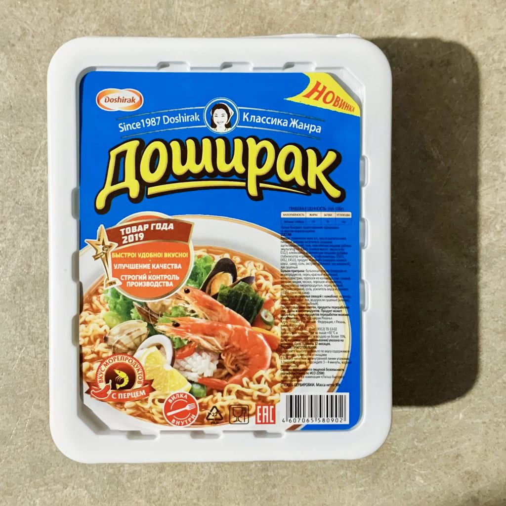 «Доширак» для русского человека — особый бренд. Среди прочих бич-пакетов это твердый средний класс: стоит не слишком дорого, вкус насыщенный, острота такая, что на пот прошибает, сама лапша тонкая, но не разваривается — золотой стандарт с минимумом компромиссов. Но это если говорить про говяжий дошик — куриный тоже ничего, но характера ему не хватает. Есть и другие вкусы, но встречаются они реже. Главной загадкой для меня был относительно свежий вариант со вкусом морепродуктов — нигде его не мог найти. До сегодняшнего дня!