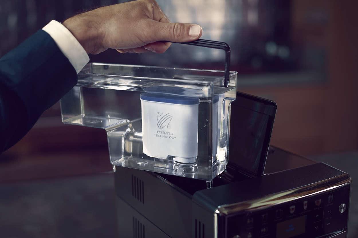 Фильтр для воды AquaClean. Запатентованное решение — фильтр для воды AquaClean — улучшает качество кофе, очищая воду. Также он предотвращает скопление известкового налета в контуре подачи воды: регулярно меняйте фильтр, чтобы готовить до 5000 чашек кофе без очистки кофемашины от накипи.