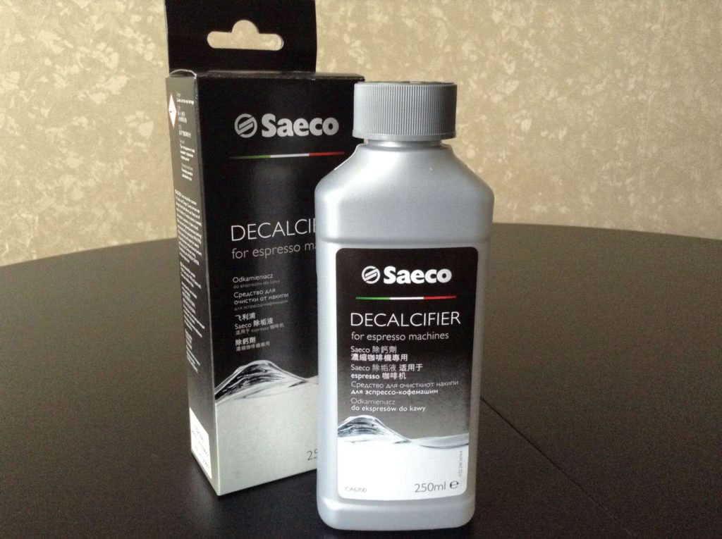 Подготовить средство для очистки кофеварок Филипс Саеко Decalcifier. Объема обычно хватает на 2 очистки, поэтому отлить половину в емкость для жидкости.
