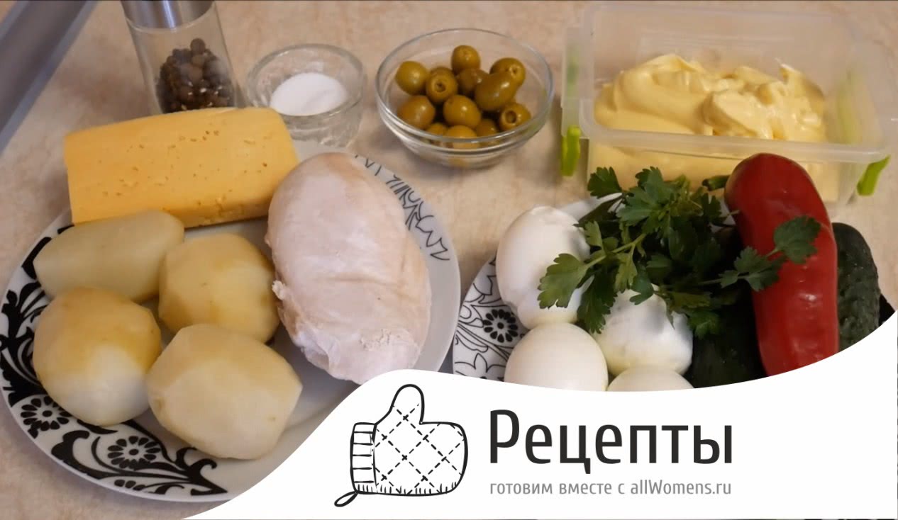 Прежде всего отварим морковь, картофель и куриное филе. В это время, нарежем вареную колбасу на маленькие кубики. Помидоры на бруски. Лук режим на кубики. Морковь и картофель можно или потереть, или порубить на мелкие кубики. Куриную грудку отберем на волокна. Все ингредиенты смешаем с майонезом и украсим маслинами.