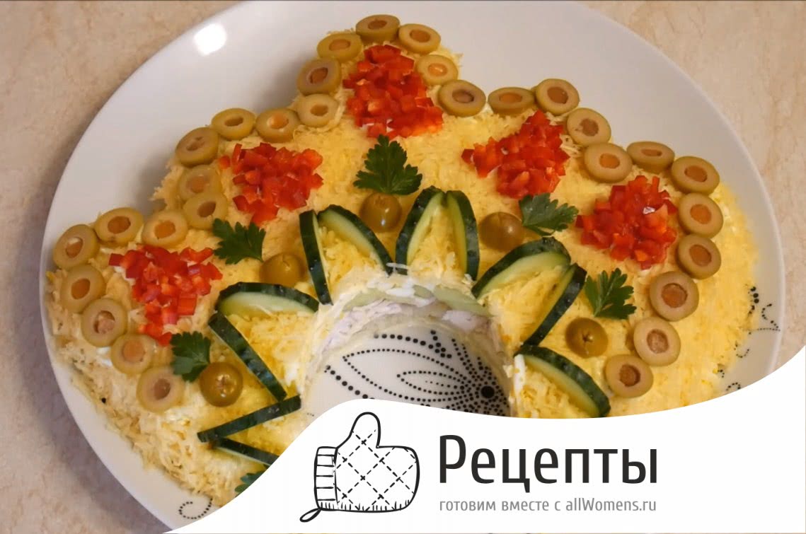 - Для украшения кокошника часть блюда покройте рубленным красным перцем, смешанным с кусочками помидоров. Сверху майонезом сделайте любой ажурный узор, который разделит поверхность салата на сегменты – в них выложите разрезанные кольцами или половинками маслины, рубленый лук и веточки петрушки.