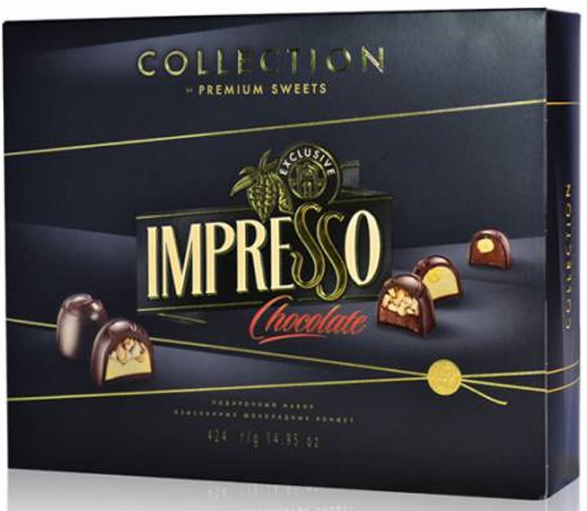 Премиальный набор Impresso черный станет безупречным подарком ценителям горького шоколада. Глубокий вкус горького шоколада дополняется изысканным фундуком и нежным пралине. Вес – 424 грамма. Средняя цена: 600-700 рублей.