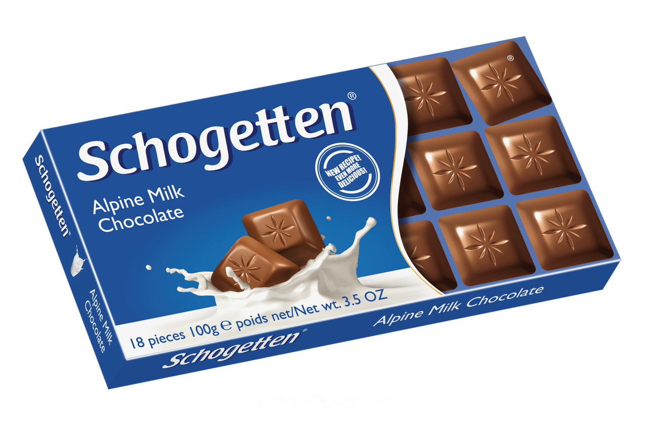 Десерт описываемого бренда носит самые разные названия, в зависимости от наполнителя. Всем известен альпийский молочный. На упаковке которого надпись: шоколад schogetten alpine milk.