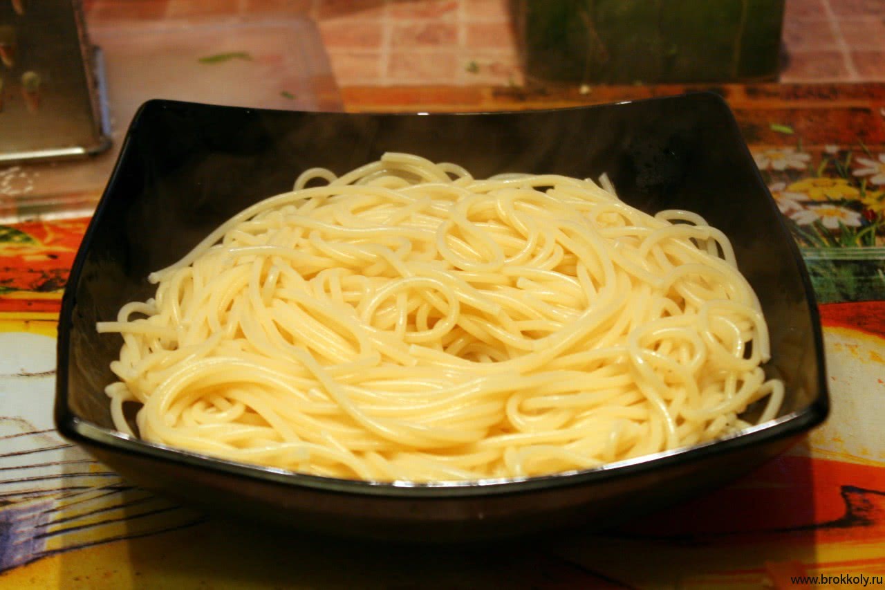 Для диетического питания спагетти нужно варить с ложкой оливкового масла, добавляемого в воду. Но в готовые макаронные изделия нельзя добавлять масло или соусы. При желании горячие спагетти можно залить яичным белком.