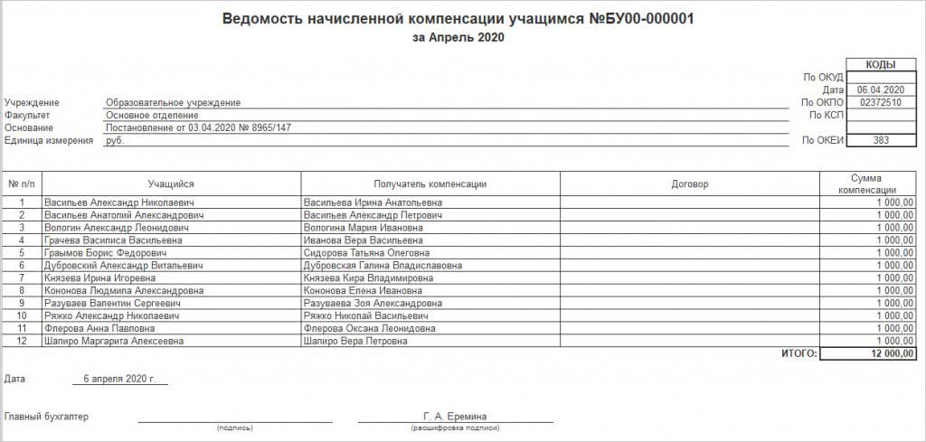 Следует отметить, что если основание начисления компенсации общее для всего документа — указано в шапке документа Начисление компенсации учащимся, оно отражается в шапке ведомости; если основание начисления компенсации указано в таблице Компенсация, оно будет выведено в соответствующей строке ведомости.