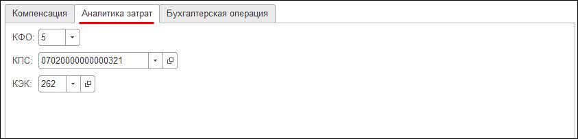 На закладке Аналитика затрат указываются общие для всего документа КФО, КПС и КЭК, по которым будет начисляться компенсация. Данная закладка доступна для заполнения, если не установлен флаг Аналитика затрат в каждой строке.