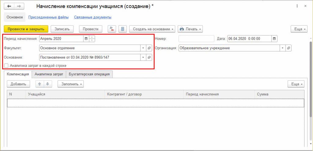 В табличной части закладки Компенсация кроме Учащегося и Суммы компенсации также указываются:
