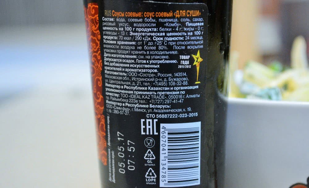 Пластмассовая бутылочка с иероглифами – это точно не лучший вариант. Обычно именно так выглядит подделка. Продаваться соус должен только в стекле. Бутылка обязательно должна быть прозрачной, а содержимое иметь темно-коричневый цвет. Есть отдельные разновидности светлого цвета, но на российском рынке они встречаются реже.