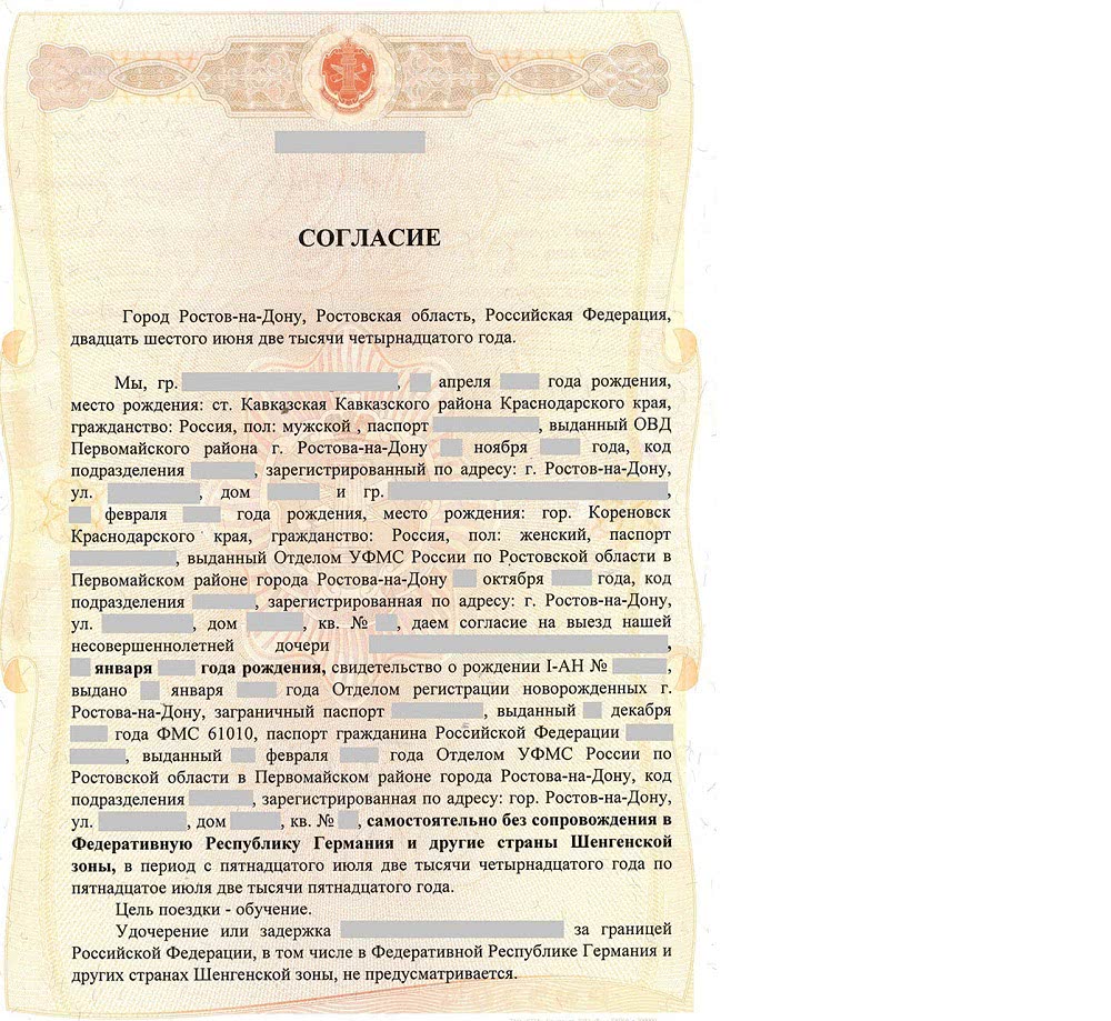 Большинство стран Шенгенского соглашения в теории не требуют наличие переведенного согласия на выезд. Подразумевается, что все формальности были соблюдены при оформлении визы. А вот как это выглядит на практике: