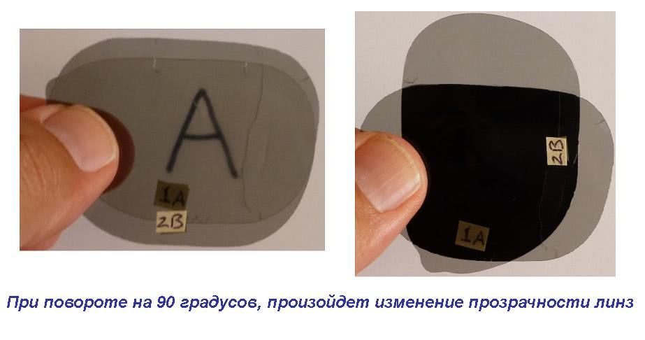 - Два в одном. Наденьте очки, вторые (такие же) преподнесите на расстояние 10-15 см от первых и медленно поворачивайте их до угла в 90°. Линзы должны полностью потемнеть, если сохранилась частичная прозрачность, значит фильтр в одном из очков поляризует не на 100%.