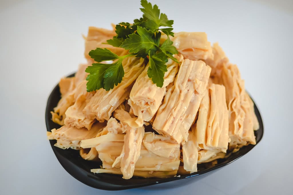 Соевая спаржа представляет собой полуфабрикат, получаемый из бобов сои, которые кипятят на соевом молоке. В результате образуется пленка, которая и получила название соевой спаржи. Пищевая ценность такого продукта намного выше — 387 ккал на 100 граммов.