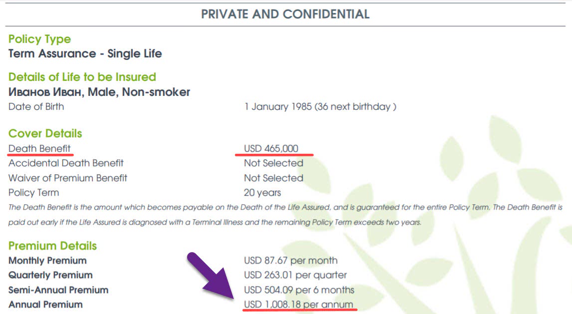 Однако нужно понимать, что зарубежные страховщики зачастую устанавливают минимальную страховую премию для тех россиян, которые хотели бы стать их клиентами. На момент написания этой статьи минимальный взнос по зарубежной страховке жизни составляет 1.000 USD в год. Ежегодно уплачивая эту премию, наш 35-летний клиент сможет защитить свою жизнь на 465.000 USD от смерти по любой причине: