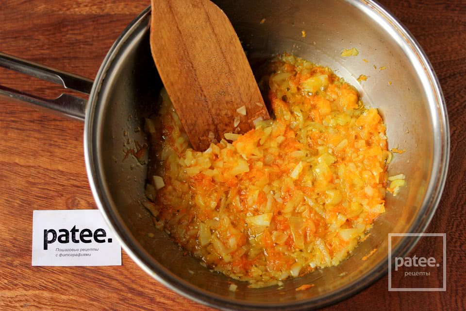 Обжариваем лук и морковь до мягкости на протяжении трёх минут на среднем огне, часто помешивая. Снимаем сковороду с зажаркой с плиты.