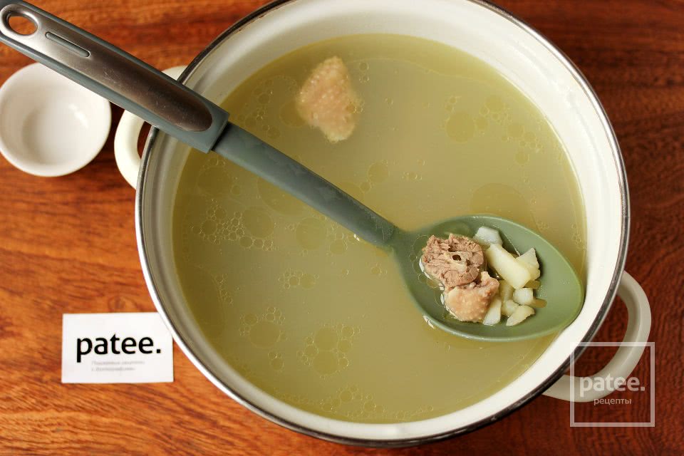 Готовое мясо достаем из бульона, а сам бульон процеживаем от случайных осколков или косточек. Возвращаем бульон на огонь, добавляем в него картошку и промытую перловую крупу. Варим суп после этого около 15 минут.