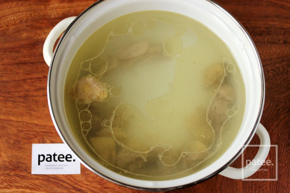 Разделываем курицу, моем и варим из нее бульон с солью, перцем и специями.