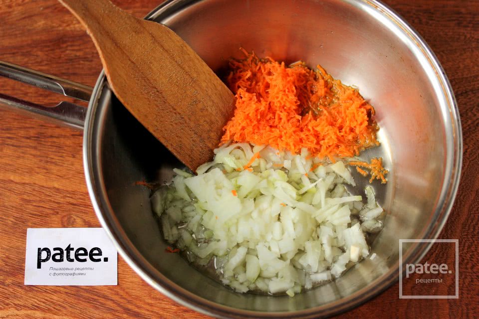 Хорошо разогрейте сковородку на сильном огне, после того, как сковорода нагреется, налейте на нее 2 столовые ложки подсолнечного масла без запаха. Немного убавьте огонь и выложите на сковородку нарезанный лук. Обжарьте его при постоянном помешивании в течение 2-3 минут. Затем добавьте тертую морковку и тщательно перемешайте. Обжаривайте овощи при постоянном помешивании в течение 3-5 минут. Переложите зажарку на тарелку.