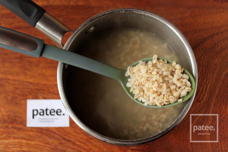 Для начала ставим отвариваться перловую крупу. Для этого крупу промываем, в небольшой кастрюльке доводим до кипения воду, слегка солим её и закладываем перловку. После повторного закипания воды огонь убавляем и варим перловку до готовности.