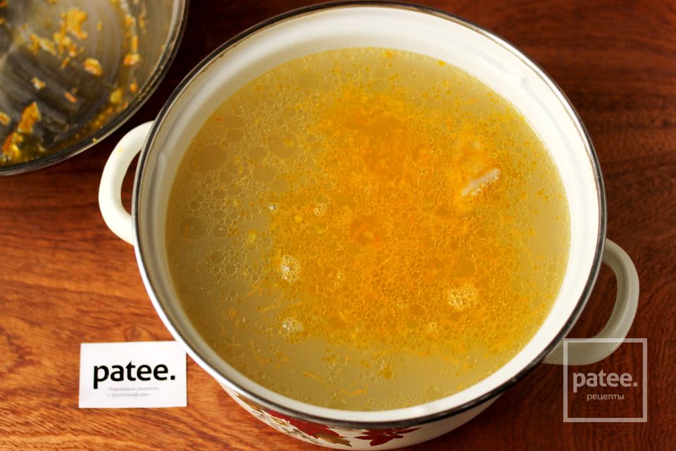 Вслед за перловкой в суп перекладываем обжаренные лук и морковь со сковороды вместе с малом, на котором овощи обжаривались.