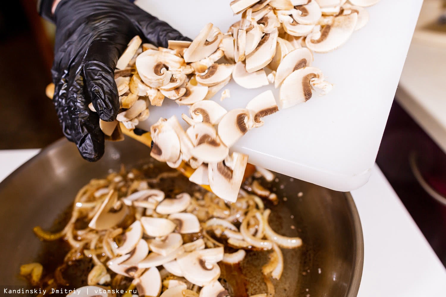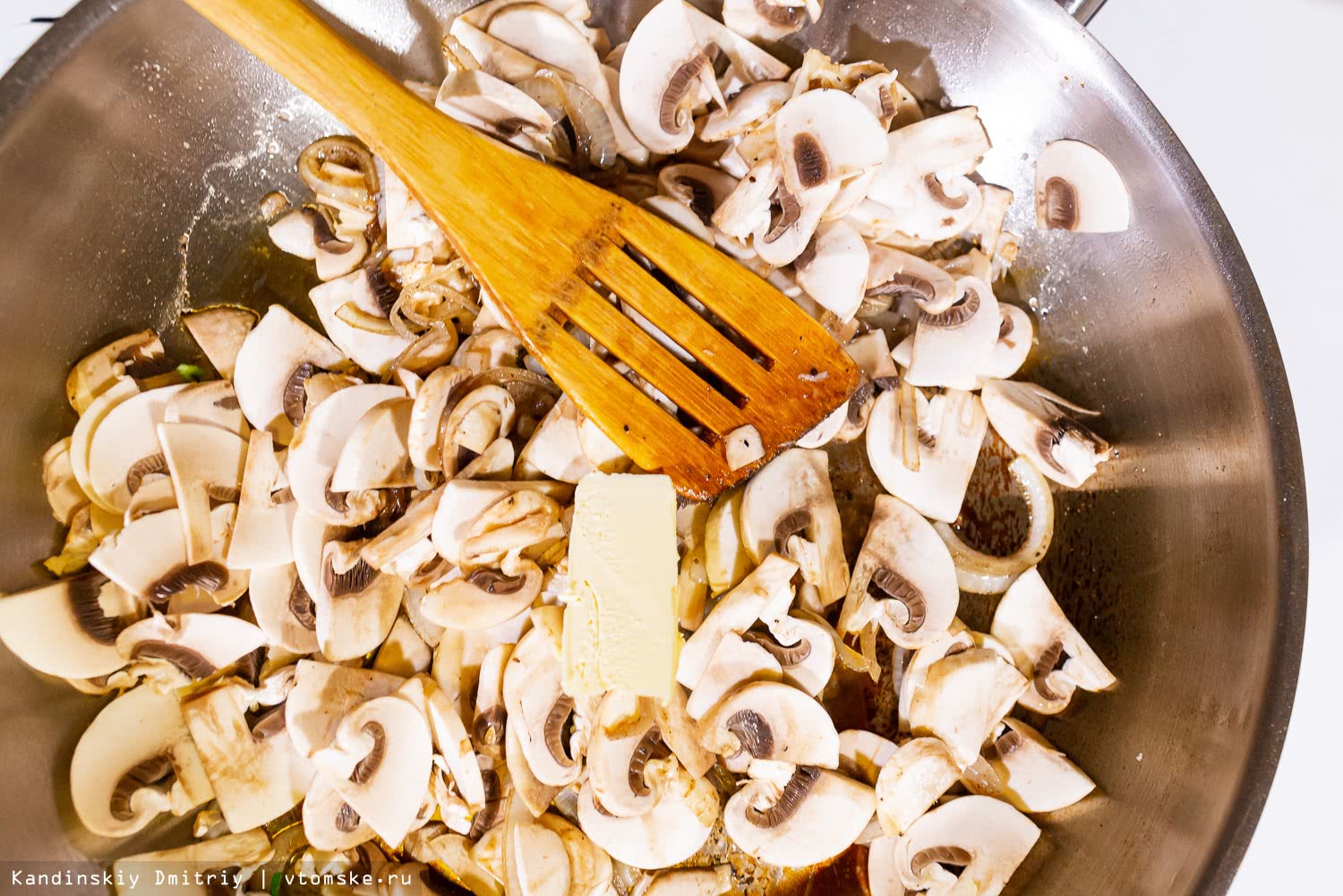 После этого мясо откладываем, нарезаем среднюю луковицу на четвертины кольца, убавляем огонь до чуть выше среднего и закидываем лук в сковороду, где жарились наши стейки. Как только лук чуть размягчится, добавляем к нему нарезанные на пластины грибы.