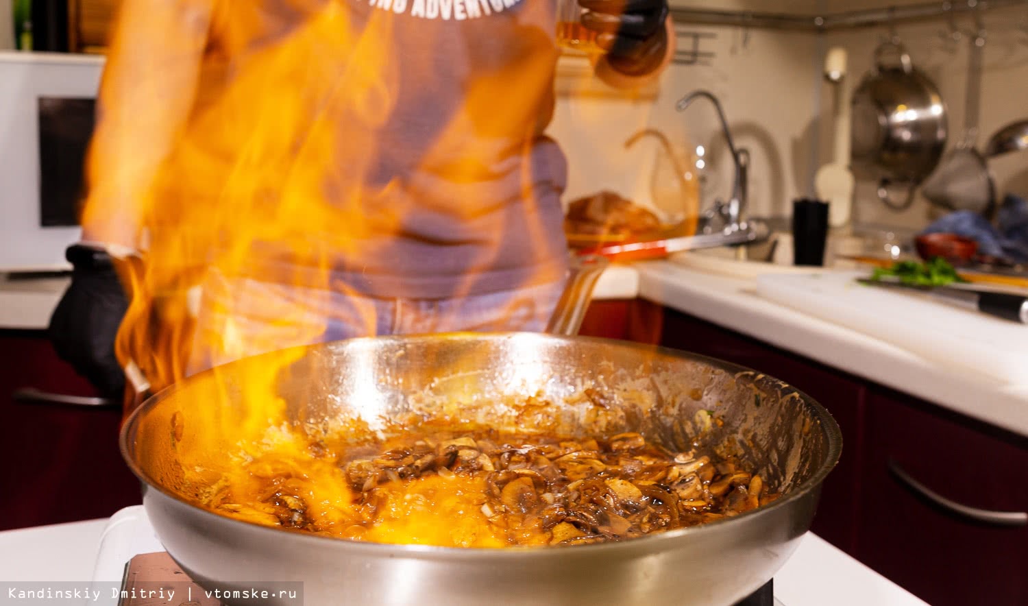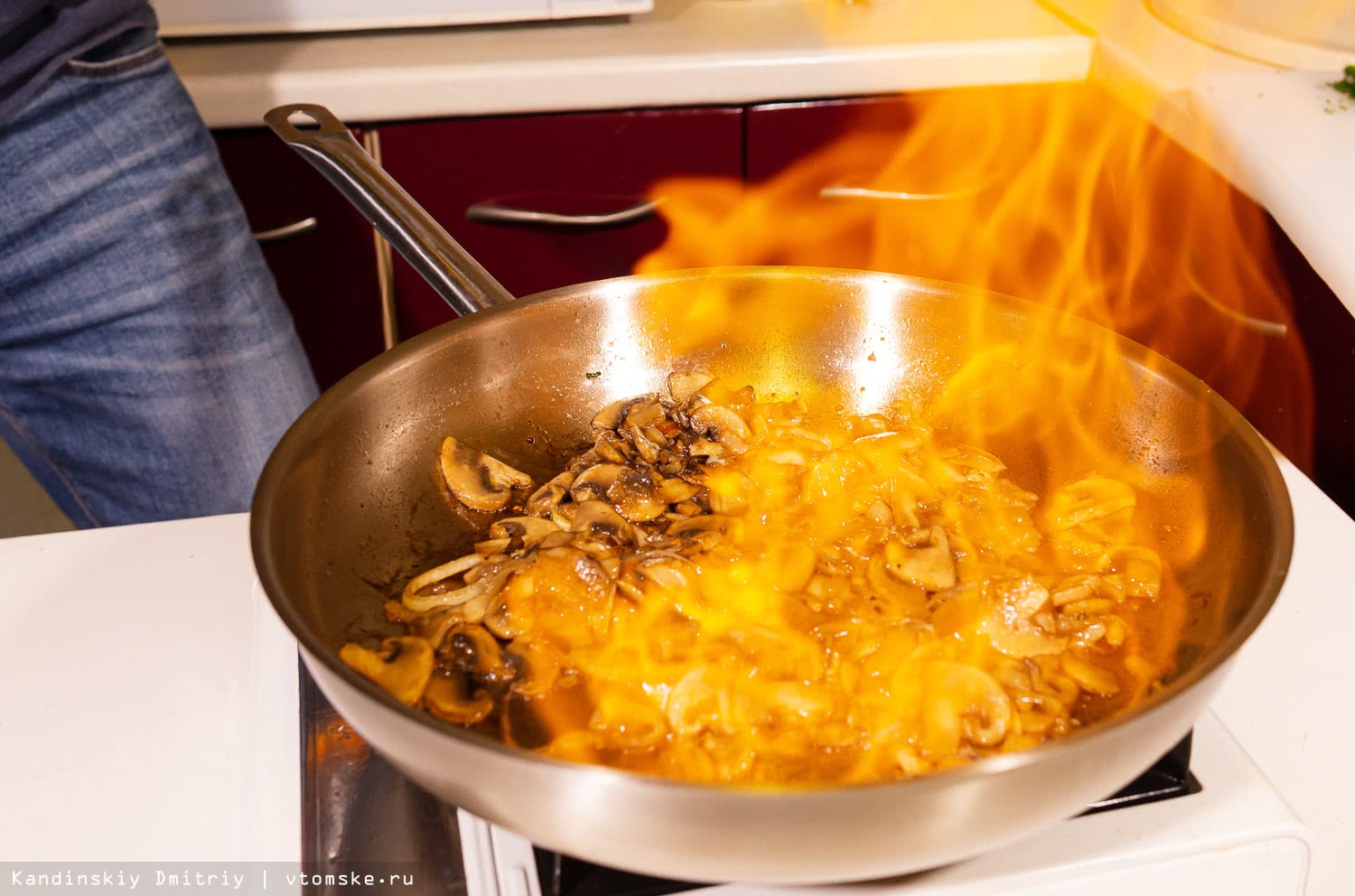 А теперь пришло время для фламбе! Вооружаемся примерно 30 миллилитрами коньяка или бренди, а также зажигалкой. Вливаем в сковороду алкоголь и тут же его поджигаем