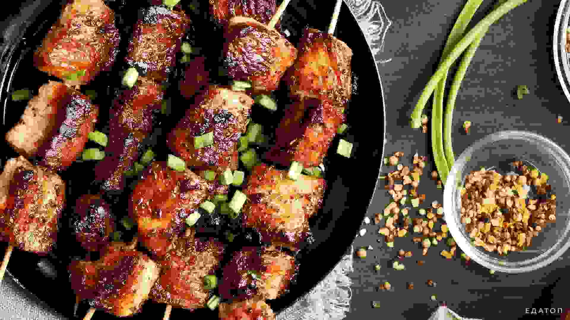 Классический таджикский шашлык делают из кусков баранины и курдючного сала, которые чередуют на шампуре. К нему на гарнир подают обжаренные на углях овощи на шпажках.