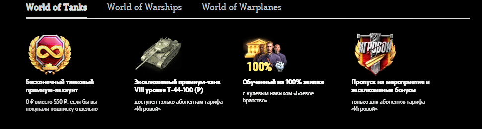 Также тариф «Игровой» включает игровую опцию «Wargaming». Она включает бесконечный премиум аккаунт в World of Tanks (без абонентской платы), обученный на 100% танковый экипаж с нулевым навыком «Боевое братство», премиум-танк Т-44-100 (Р) VIII уровня, бесплатный пропуск на игровые мероприятия и премиальные бонусы. Также предусмотрены бонусы и премиум-аккаунты для игр World of Warships и World of Warplanes.