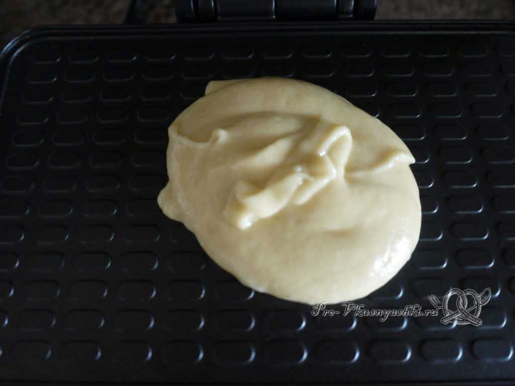- На горячие, смазанные маслом, панели вафельницы выкладываем приготовленное тесто порциями, опускаем подвижную часть.