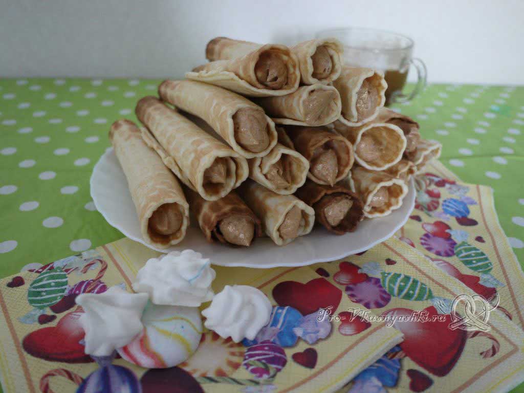 - Выкладываем в вафельницу с неглубоким рельефом небольшие порции теста, готовим пару минут, извлекаем и придаем форму трубочек, скрученных в один слой.