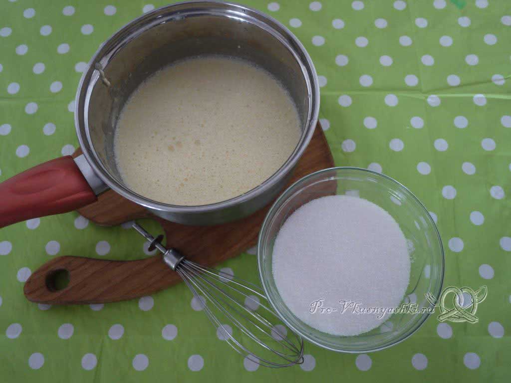 Постепенно всыпаем в сотейник сахар (1 ст), добиваемся однородности.