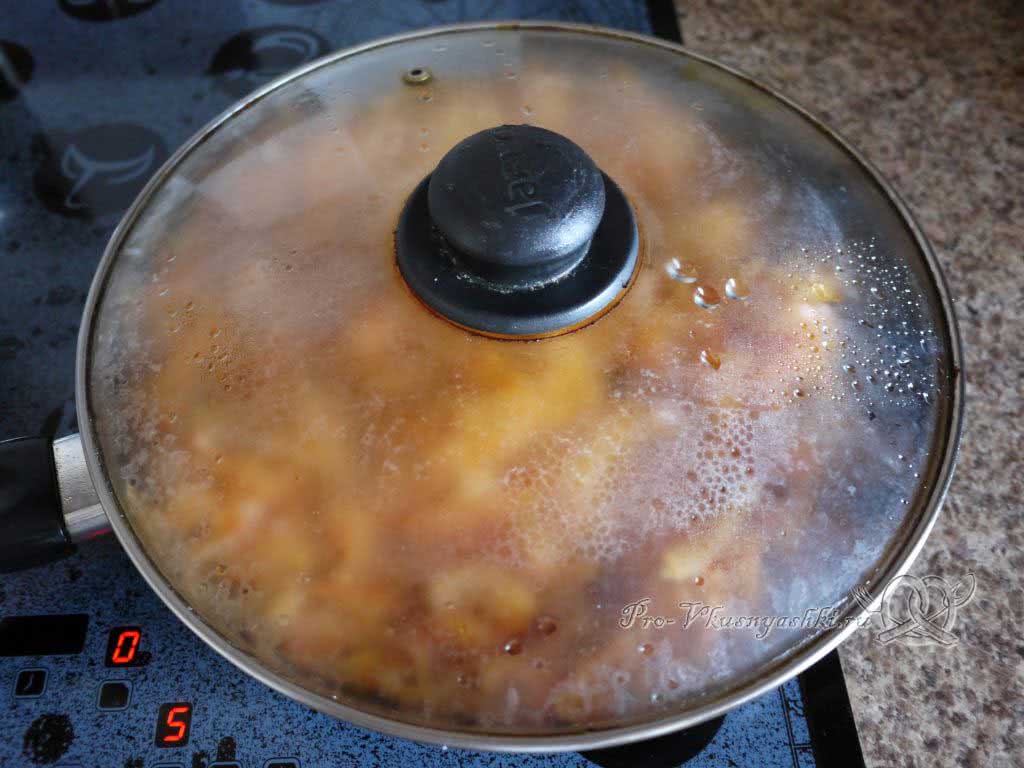 Накрываем посуду крышкой и тушим ее содержимое на среднем огне в течение 30-40 мин до готовности. Все ингредиенты должны стать мягкими и буквально таять во рту.