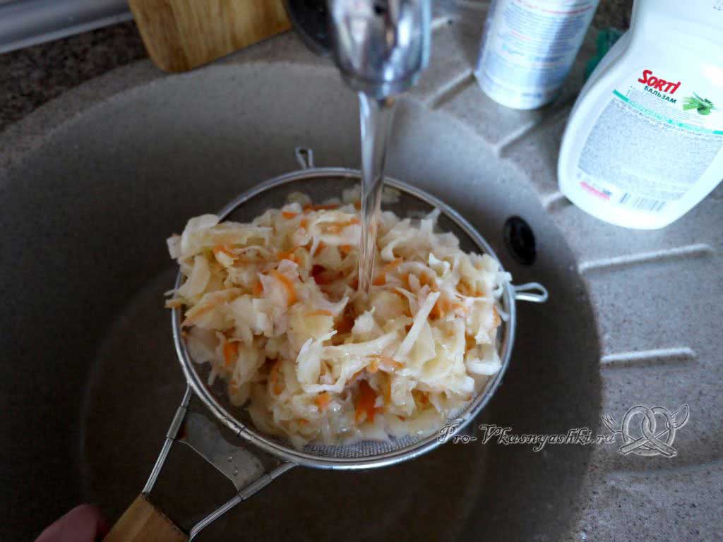 Квашеную или соленую капусту необходимо промыть под струей холодной воды до исчезновения кислого или соленого привкуса.