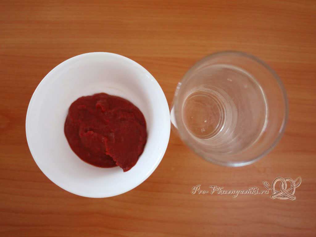 Томатную пасту (2 ст.л) смешиваем с водой (1 ст).