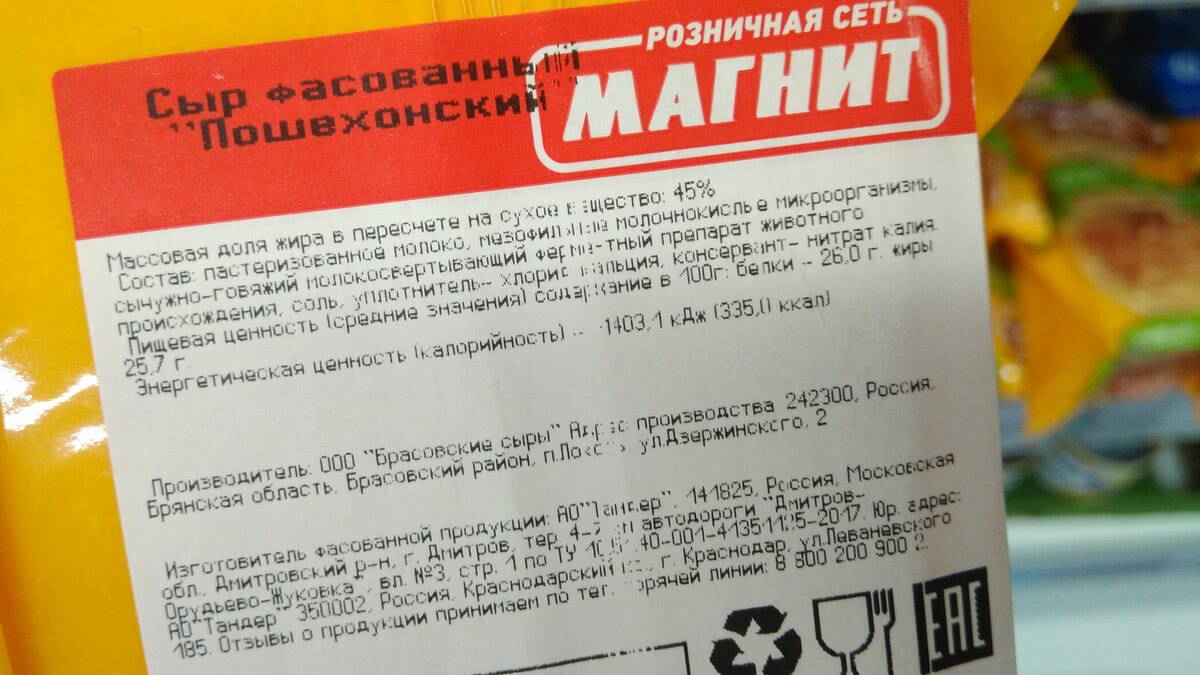 У пошехонского из «Магнита» очень мягкая и ломкая консистенция, что заставляет сомневаться в его натуральности.