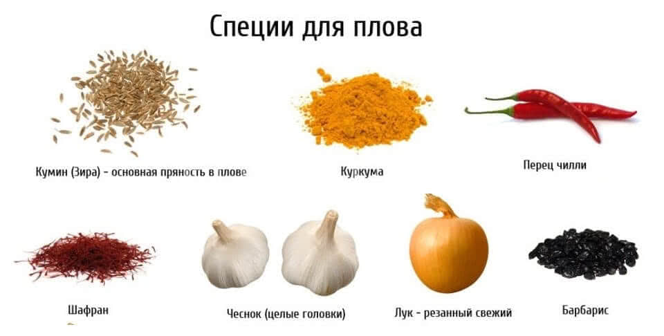 - плов без специй – не плов. Обязательно используют зиру и свежий чеснок, по желанию – барбарис, перец, куркуму.