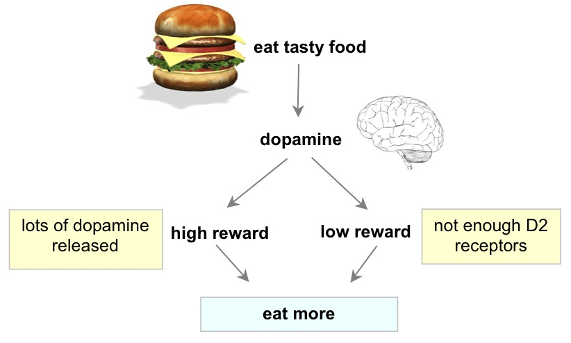 Когда количество дофамина слишком большое, мозг сокращает количество рецепторов к нему, чтобы сохранить баланс. Если есть меньше рецепторов, нужно больше дофамина, чтобы достичь прежнего эффекта. И это заставляет людей употреблять больше нездоровой еды, чтобы достичь того же уровня вознаграждения, как и раньше.