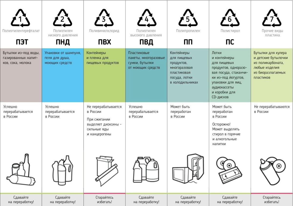 — 1 — ПЭТ (PET) полиэтилентерефталат — 2 — ПВД (HDPE) полиэтилен высокого давления — 3 — ПВХ (PVC) поливинилхлорид — 4 — ПНД (LDPE) полиэтилен низкого давления — 5 — ПП (PP) полипропилен — 6 — ПС (PS) полистирол — 7 — OTHER другие полимеры, которые вторично не перерабатываются